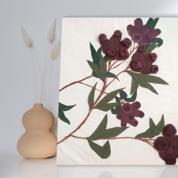 This small pair of painted tapestries represent a gum tree in different seasons. I was inspired by the contrast of the delicate flowers against the sturdy nuts. The beige background has a subtle wrinkled texture to it, giving more dimension to the pieces. Wrapped around second hand frames, these sustainable tapestries are the perfect touch for a rustic, minimalist home or office.
